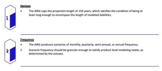 The number of scenarios within a scenario set is an important assumption as each scenario has a unique potential to expose different outcomes and risks. The AIRG can generate from 50 to 10,000 scenarios, but the user must decide on the appropriate number for the given use case. Using too few scenarios (e.g., 50) may not produce sufficient convergence. However, more scenarios (e.g., 10,000) may result in infeasible actuarial model runtimes.
