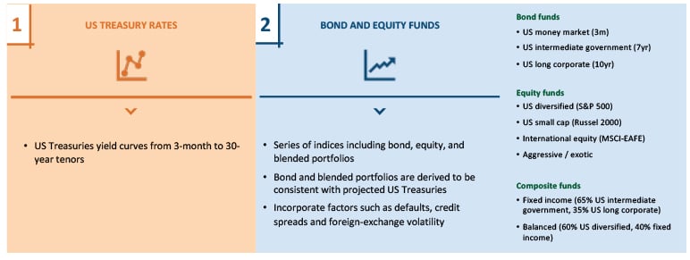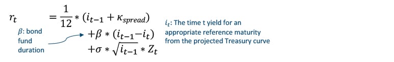 For each of the three bond funds, the mechanics (1) tie the fund return to the Treasury rate generated through the interest rate model at specific reference maturities, such as 10-years for the long duration corporate fund and (2) apply a spread adjustment appropriate for the riskiness of the underlying bonds. This enforces an internally consistent worldview between the interest rate process and the bond funds.