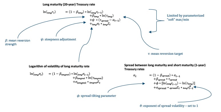 - Steepness (ψ) and spread tilting parameters (𝜙) are applied to the long rate and spread processes, respectively, to reduce the likelihood of unrealistic inversion events compared to historical data.