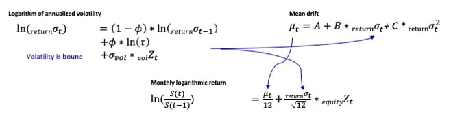 A fairly straightforward mean-reverting process drives the log volatility, which serves as the volatility for the mean drift component. These components are then combined to produce the monthly log return.