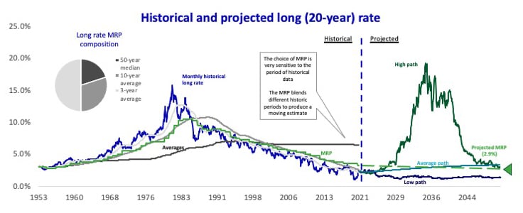 As noted previously, there is one particularly important parameter, the 20-year MRP, that is set by the ESG user using a prescribed blend (i.e., ratios and interpretation are prescribed and enforced by the ESG) of three-, 10-, and 50-year benchmark rates at the time of valuation; this allows the AIRG to be dynamic to evolving rate conditions without the need for constant rebalancing by the Academy.