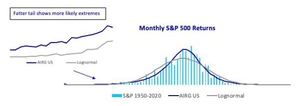 When comparing AIRG S&P 500 projections against a lognormal model parameterized to the same mean and volatility, the SLV has a tighter fit to the distribution of historic data. The AIRG exhibits some attractive qualities such as fatter tails and a skewed long left tail. Ultimately, the chosen parameters do rely on subjective judgement, such as evaluating historical interest rate patterns and defining a “reasonable” expectation of equity risk premium to set long-term return averages. The Academy periodically reviews the validity of underlying parameters.