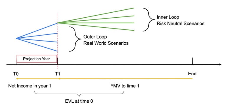 The core to these models is the nested stochastic-on-stochastic structure, formed by several “inner” loop scenarios diverging from each of the “outer” loop scenarios at a future time point. The scenarios are simulated by stochastic methods based on underlying economic risk variables from real-world or risk-neutral probability distribution. This two-layer loop of scenarios are then passed into a liability cash flow system (such as AXIS)[1] to project cash flows over the time horizon of the product and then to estimate the desired statistics such as best estimate or Value-at-Risk (VaR).