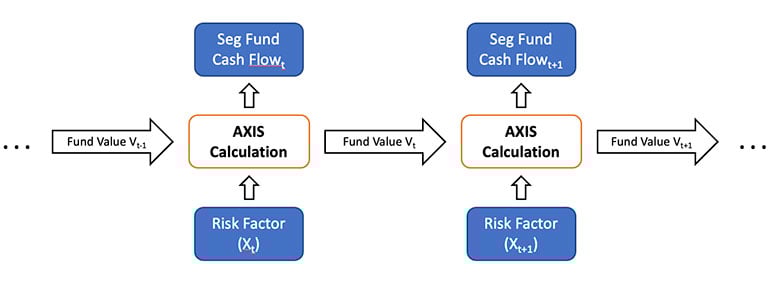 Traditional models for seg fund cash flow calculation are developed in the widely used GGY AXIS platform. At each time step across the policy life, the in-force fund value (V) from the previous step, plus economic risk factors (X) and other static actuarial assumptions from the current step are fed into complicated calculations empowered by AXIS, to project the cash flows, to update policy values after complex policy features such as resetting of guaranteed benefits (G), and to output the fund value from policies in force at the current time point. Mathematically, the relation among risk factors, fund value and our target cash flow can be formulated as follows.