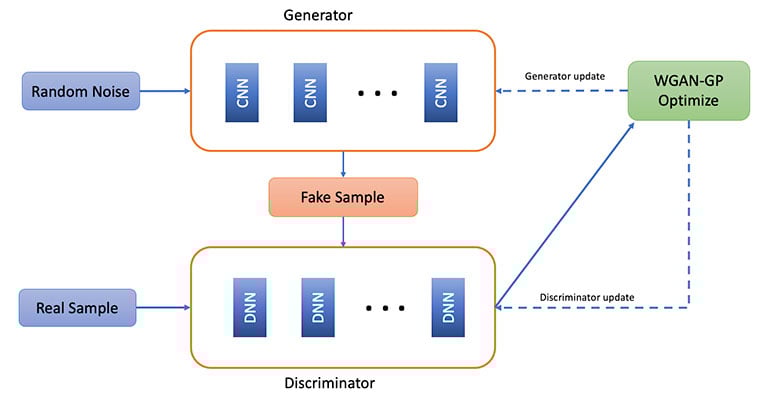On top of the WGAN, improved training of Wasserstein GANs was proposed by Ishaan Gulrajani (6) to address the convergence problem in WGAN. In this article, we experiment with the application of WGAN-GP to the simulation of future stock returns as an alternative to complement traditional scenario generation methods such as GARCH. The process is demonstrated as below: