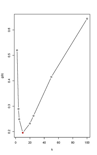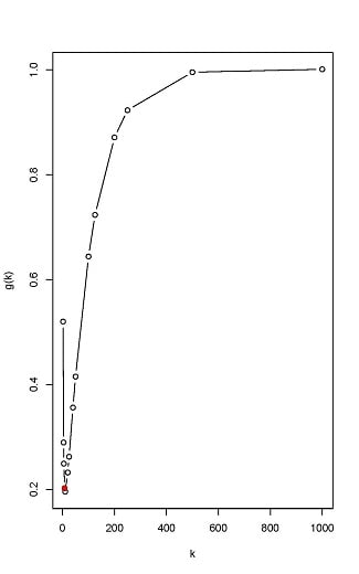 After calculation, the theoretically optimal k can be chosen as 100, and the corresponding g(k) = 0.02.