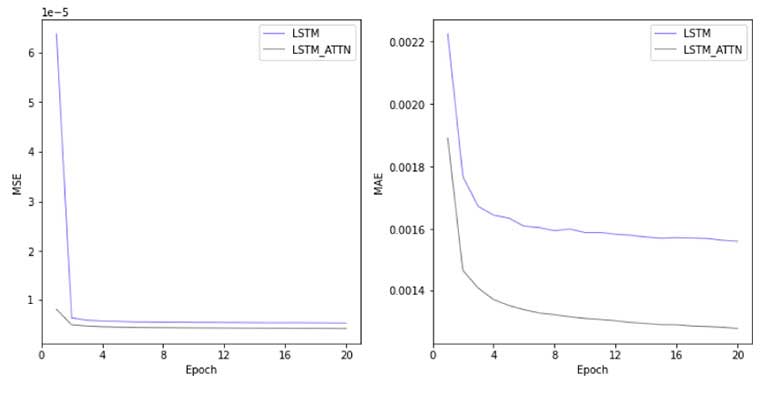 The training process of the LSTM and LSTM-Attn models demonstrates that, subsequent to a sudden drop through the first two epochs, the MSE and MAE performance metrics for both models continuously declined to statistically low levels by 20 epochs, while the LSTM-Attn model consistently outperformed the LSTM model across the epochs. After 20 epochs, the LSTM and LSTM-Attn model results converged sufficiently. (See Figure 5)