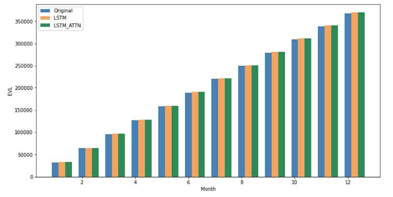 Additionally, we calculate the one-year economic capital requirements as the difference between VaR(99.95) and the average of projected cash flows (in present value discounted with a discounting rate of 1.79 percent), and find the results of the LSTM and LSTM-Attn models to be lower than the original LSMC results, but still relatively close, with LSTM-Attn producing more precise tail projections, as shown in Table 1.