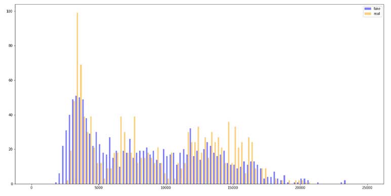 The comparison of simulations from WGAN (“fake” returns) against the historical distribution of the in-sample data (“real” returns) in terms of monthly return is illustrated by the histogram of Figure 7.