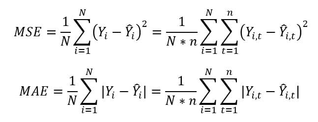 We compare the performance of different cash flow simulation methods (traditional LSMC, LSTM and LSTM-Attn) by two evaluation metrics, mean squared error (MSE), which measures the average squared difference between the estimated and the actual values, and mean absolute error (MAE), which measures the average absolute errors between the estimated and the actual values. For estimates Ŷi ={yi,t}and actual values Yi={yi,t} t=0,...,n i=1,2,...,N samples, they are defined as: