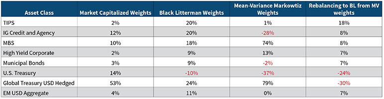 One can see that the BL optimized weights allocate a higher percentage to TIPS and MBS indices (Table 1). Additionally, the short on the US Treasuries (the index components are weighed heavily toward the long end) implied from the Black-Litterman weights conveys positioning for a “curve steepener.”