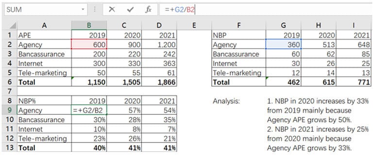 A spreadsheet is a geographic map made of columns and rows. Data are stored in geographic cells. When we refer to a piece of data, we do not do so directly on the data. We actually refer to the cells where the data sit. For example, when we calculate NBP%, we cannot directly type a formula “NBP%=NBP/APE.” Instead, we have to translate the formula into a geographic reference and type “=G2/B2” to get the Agency NBP% in 2019. Such mental translation is done manually and can hardly be automated. This means a loss in efficiency.