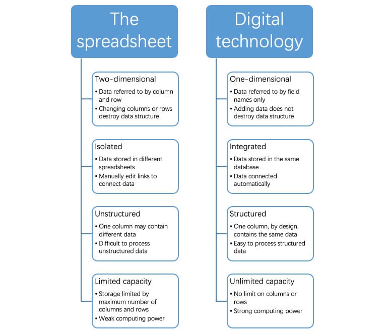 Therefore, we see how the spreadsheet is hindered by its own design for higher efficiency. Though we may improve efficiency through model optimization, VBA, and a well-written operation manual within the spreadsheet paradigm, the improvement is modular at best. We will make a quantum leap if we make a paradigm shift to digital technology. The effect is akin to upgrading from a car to an airplane.