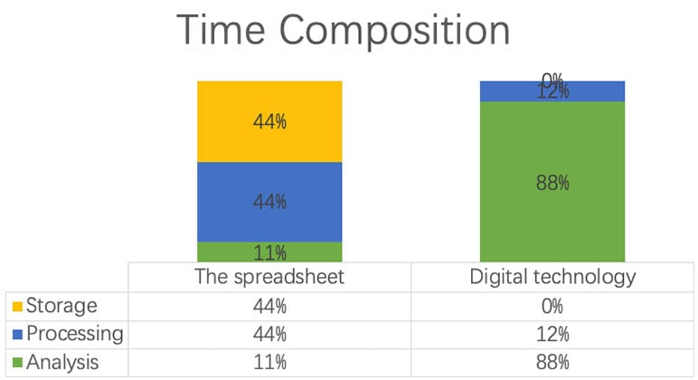 Two important lessons are drawn from this case study. First, efficiency improves by 16 times. Secondly, time composition changes drastically: The data analysis stage used to take only 11 percent of the time, but now takes 88 percent of the time. Digital technology releases us from mundane tasks in the data storage and processing stage and lets us spend more time in higher-value tasks in the data analysis stage. The implication is far-reaching. In how much of our work do we have the luxury to devote the majority of the time to analysis? How much of our staff is not engaged in the data analysis stage?