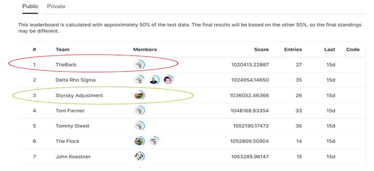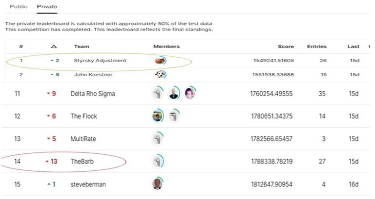 But now, look at the final private leaderboard in the picture below. Styrsky Adjustment moved to first and The Barb moved to 14th.