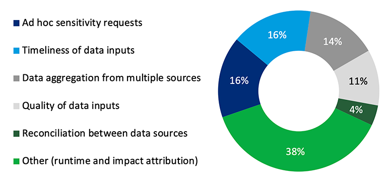 ALM reporting can present various challenges to insurers in terms of data quality and timeliness, metric complexity, and cross-team collaboration. According to Oliver Wyman’s 2023 ALM survey, over 60% of participants selected one of these challenges as a top challenge in ALM reporting, illustrated in Exhibit 2 below. Only 57% of participants indicated they are able to spend more time on analysis than model maintenance.
