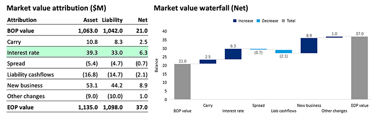 XYZ also implemented a risk-factor based attribution analysis that breaks down the asset and liability value changes into the common set of risk factors. As demonstrated in Exhibit 6 below, the main drivers of the change in net market value in this reporting period are interest rates and new business.