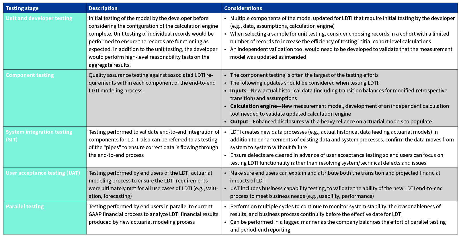 Each testing stage should have clearly outlined activities and acceptance criteria agreed upon before testing begins. This provides the ability to communicate the progress of testing to management and determine when success is achieved for each stage of testing. The actuarial modeler will most likely have to develop independent calculation tools to validate the new LDTI calculations. Planning for this effort early on during the planning phase will ensure these tools are ready when testing needs to be performed. The actuarial modeler should also consider providing an ample amount of time for UAT. The baselining effort to explain transition impacts from current GAAP to LDTI results can be more significant than a model conversion.