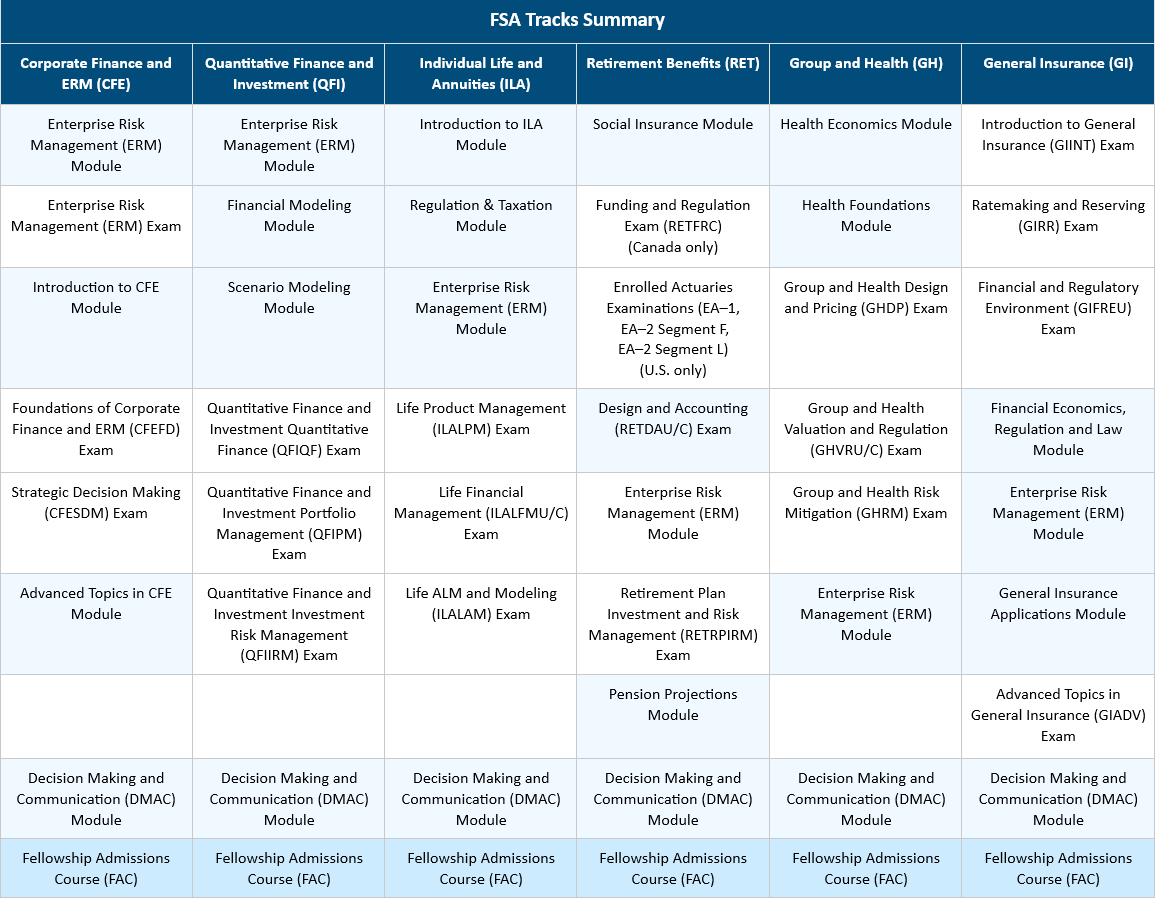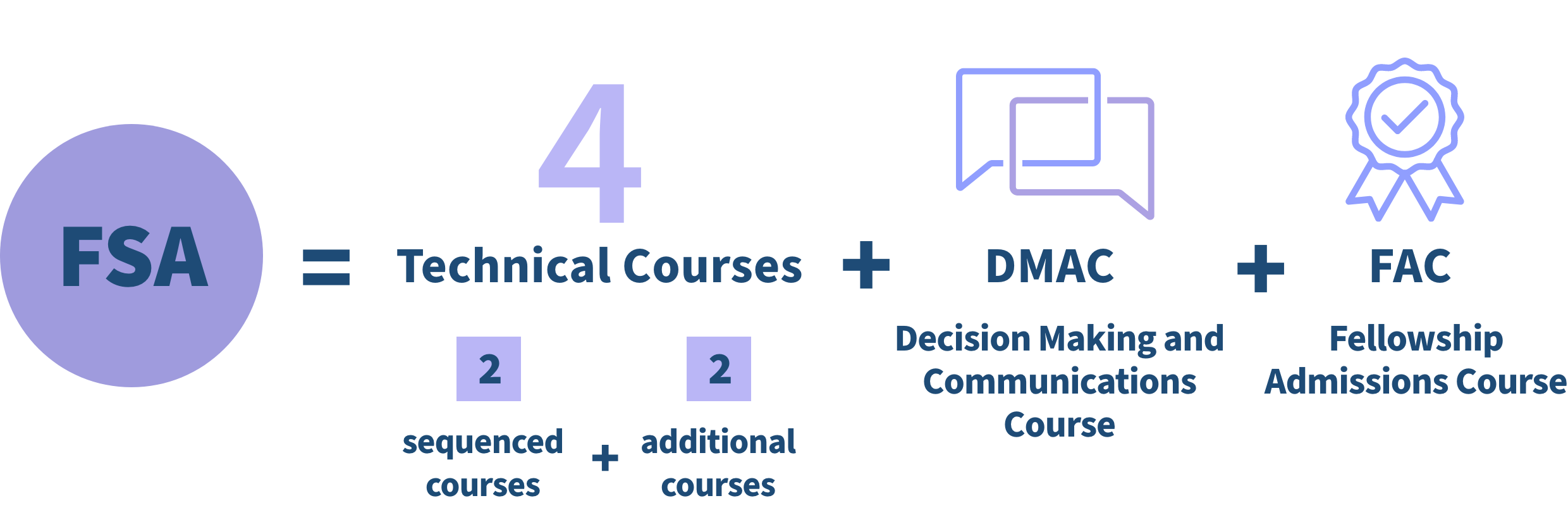 All candidates must also complete the Decision Making and Communications (DMAC) Course and the Fellowship Admissions Course (FAC). You are eligible to register for the DMAC Course after earning your ASA. You will receive an invitation to participate in the FAC after you have completed all other FSA requirements.