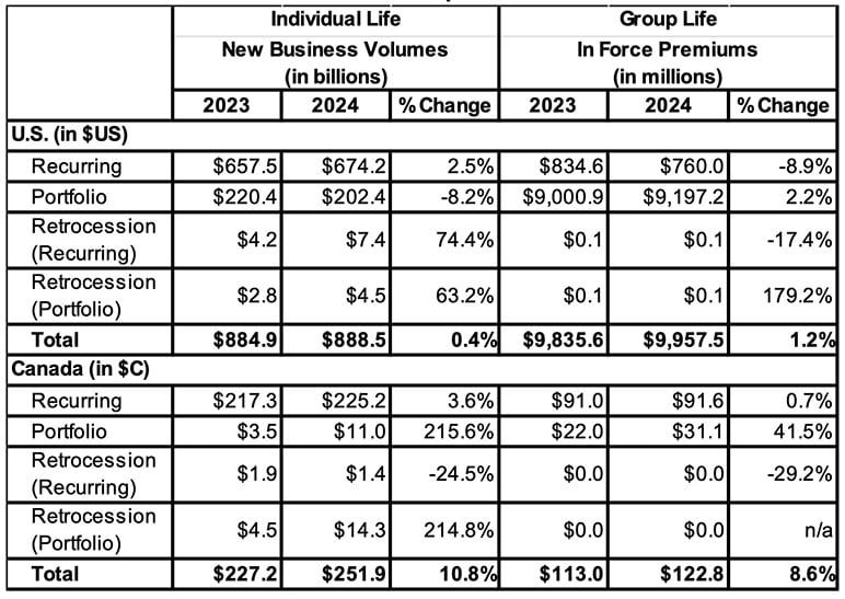 The portfolio retrocession market in Canada is also limited. Pacific Life Re reported C$14.3 billion in volume written in 2024, up over 200% over the C$4.5 billion volume they reported in 2023.