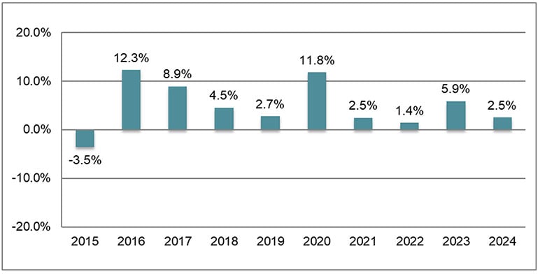 Recurring individual life reinsurance new business in Canada increased for the 10th consecutive year in 2024, growing from C$217 billion in 2023 to C$225 billion in 2024 (up 3.6%). Figure 4 shows the annual percentage change in recurring reinsurance new business over the last 10 years. Since 2015, recurring Canadian new business has grown at a 4.4% compound annual growth rate.