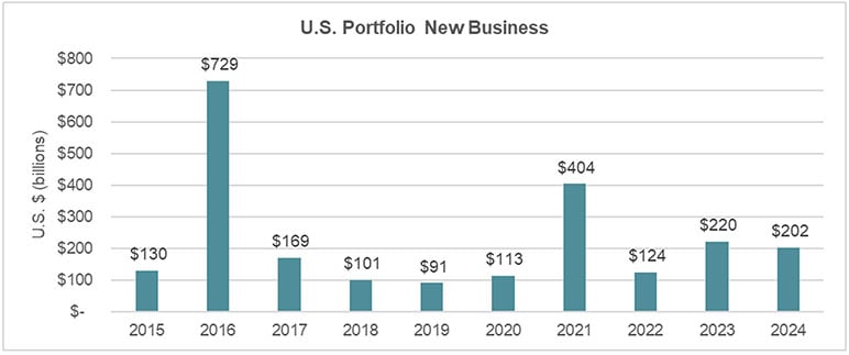 For the purposes of this survey, portfolio reinsurance is defined to include in-force blocks of business as well as financial reinsurance transactions. This definition can produce large fluctuations from year to year in reported portfolio new business results. Portfolio new business production fell in 2024, from U.S.$220 billion in 2023 to U.S.$202 billion in 2024. RGA accounted for U.S.$94 billion (47% market share) of the 2024 portfolio new business followed by Swiss Re at U.S.$55 billion (27% market share) and Munich Re at U.S.$49 billion (24% market share).