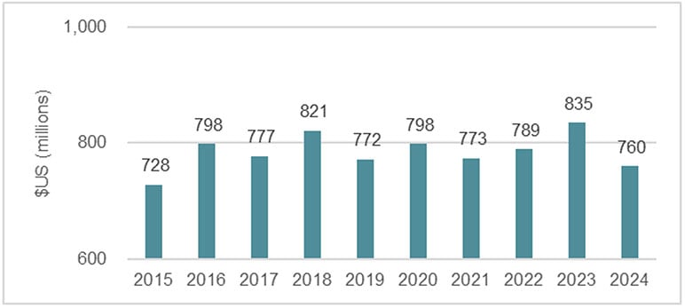 Group life reinsurers reported U.S.$10.0 billion of total in-force premium at the end of 2024, up 1% from the U.S.$9.8 billion reported at the end of 2023. Recurring in-force business accounted for U.S.$0.76 billion of the total, down 9% when compared to 2023 (see Figure 6).